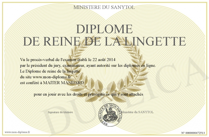 Envoyez par email votre Diplôme de reine de la lingette personalisé