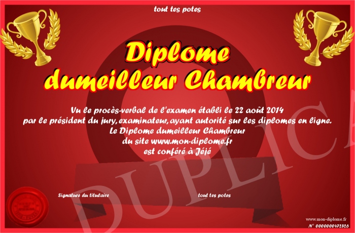 Envoyez par email votre Diplôme dumeilleur Chambreur personalisé