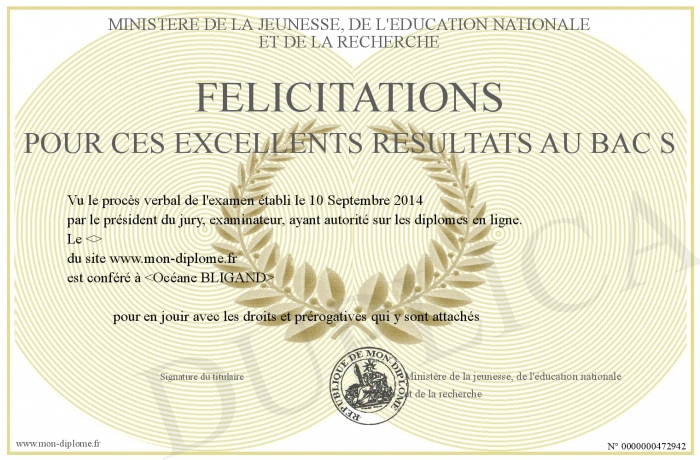 Envoyez par email votre Félicitations pour ces excellents résultats au Bac S personalisé