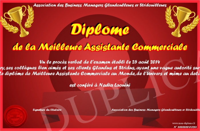 Envoyez par email votre Diplôme de la Meilleure Assistante Commerciale personalisé