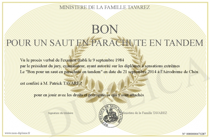 Envoyez par email votre BON POUR UN SAUT EN PARACHUTE EN TANDEM personalisé