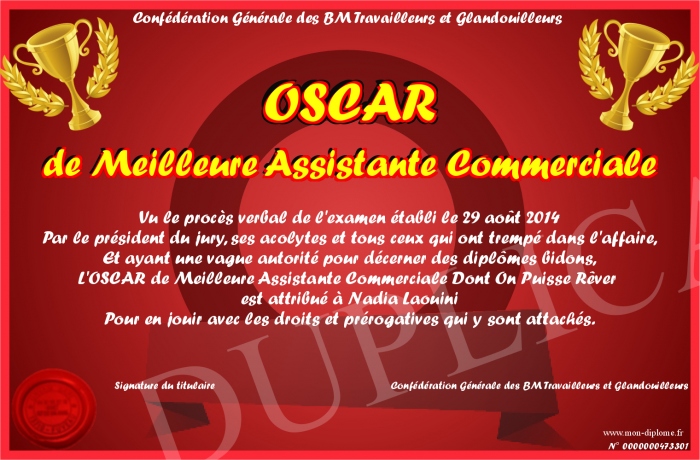 Envoyez par email votre OSCAR de Meilleure Assistante Commerciale personalisé