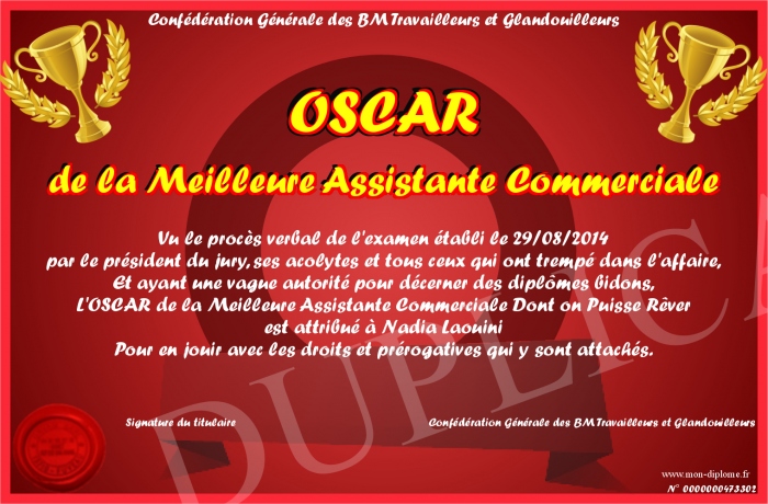Envoyez par email votre OSCAR de la Meilleure Assistante Commerciale personalisé