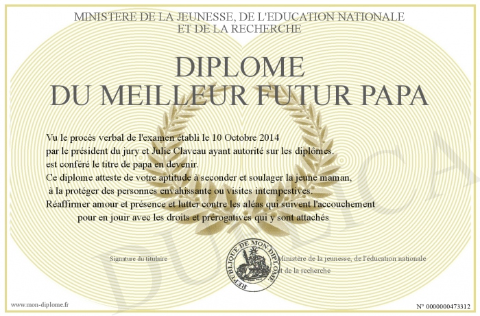 Envoyez par email votre DIPLOME DU MEILLEUR FUTUR PAPA personalisé