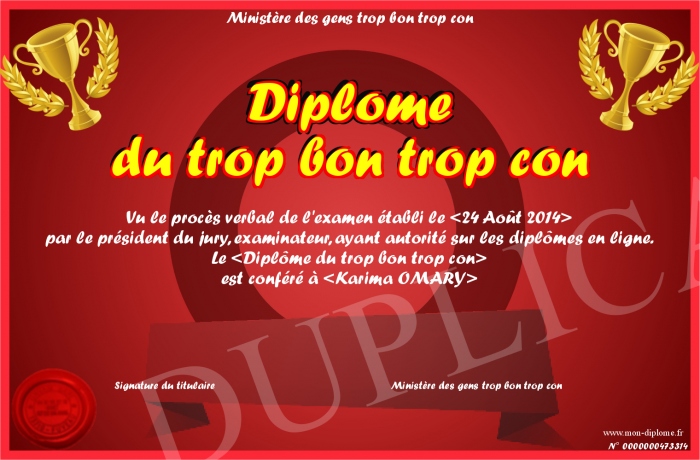 Envoyez par email votre Diplôme du trop bon trop con personalisé