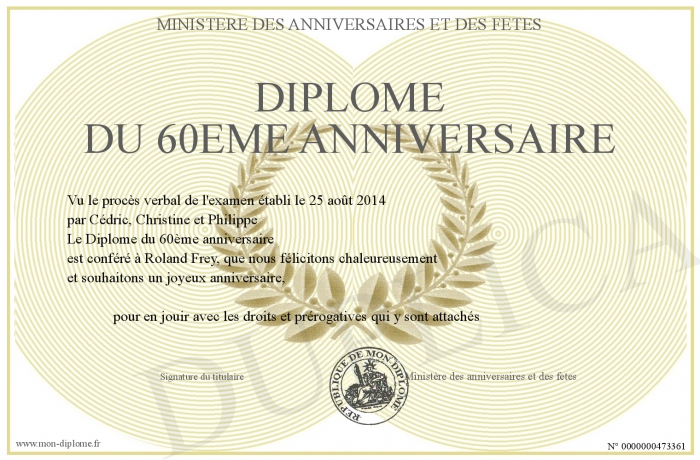 Envoyez par email votre Diplôme du 60ème anniversaire personalisé