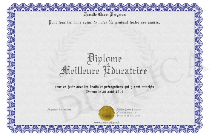 Envoyez par email votre Diplôme Meilleure Éducatrice personalisé