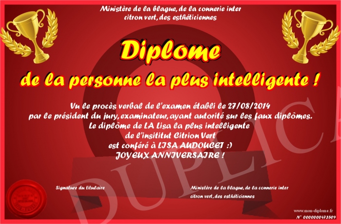 Envoyez par email votre Diplôme de la personne la plus intelligente ! personalisé