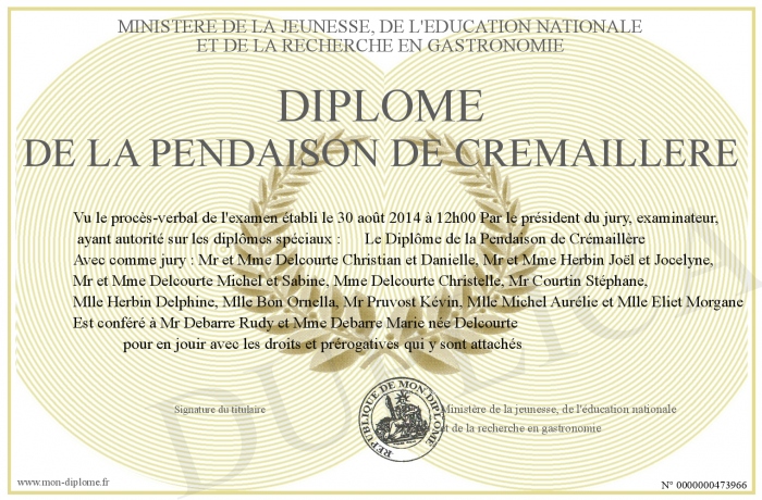 Envoyez par email votre Diplôme de la Pendaison de Crémaillère personalisé