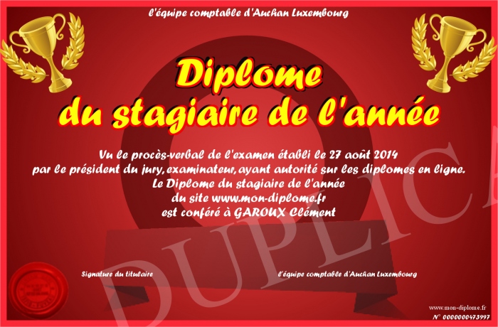 Envoyez par email votre Diplôme du stagiaire de l'année personalisé