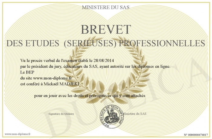 Envoyez par email votre Brevet Des etudes  (sérieuses) professionnelles personalisé