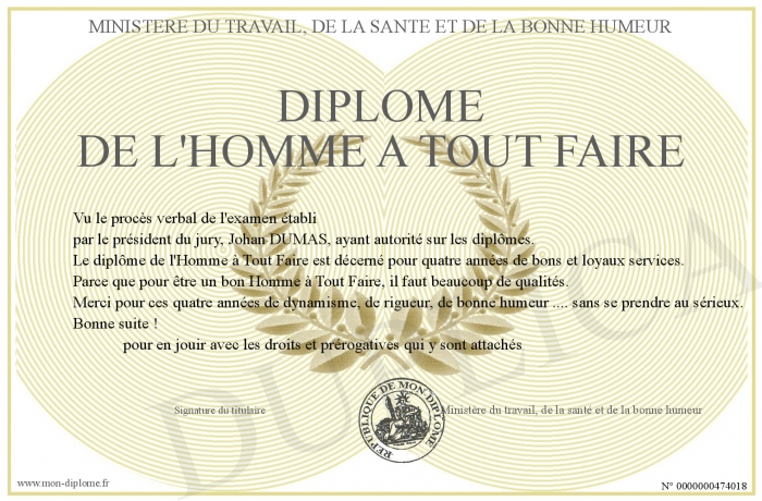 Envoyez par email votre Diplôme de l'Homme A Tout Faire personalisé