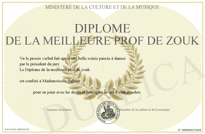 Envoyez par email votre Diplôme de la meilleure prof de zouk personalisé