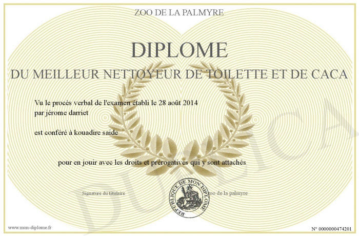 Envoyez par email votre Diplôme du meilleur nettoyeur de toilette et de caca personalisé