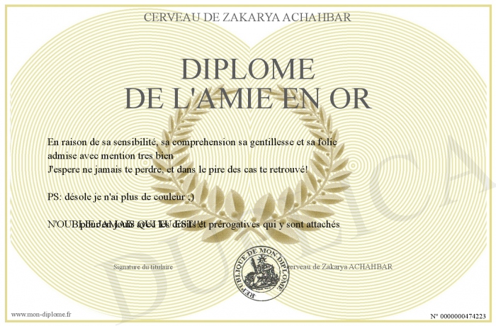 Envoyez par email votre Diplôme de l'amie en or personalisé