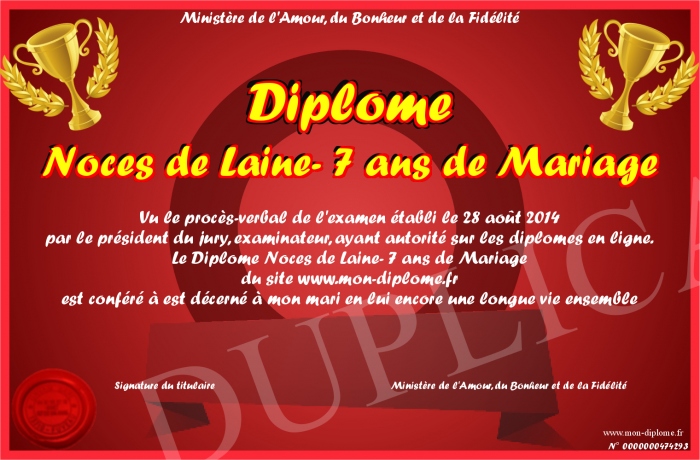 Envoyez par email votre Diplôme Noces de Laine- 7 ans de Mariage personalisé