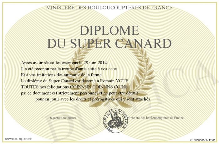 Envoyez par email votre Diplôme du Super Canard personalisé