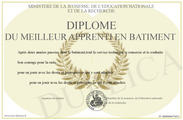 Envoyez par email votre DIPLOME DU MEILLEUR APPRENTI EN BATIMENT personalisé