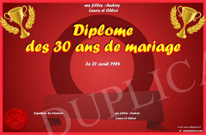 Envoyez par email votre Diplôme des 30 ans de mariage personalisé