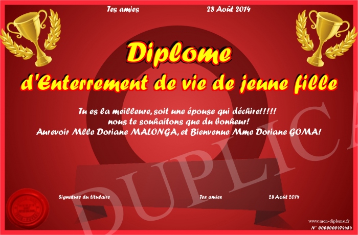 Envoyez par email votre Diplome d'Enterrement de vie de jeune fille personalisé