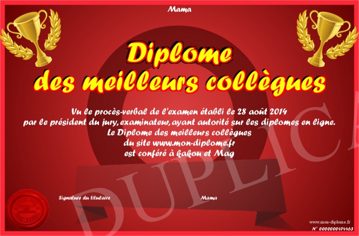 Envoyez par email votre Diplome des meilleurs collègues personalisé