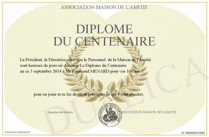 Envoyez par email votre Diplôme du Centenaire personalisé