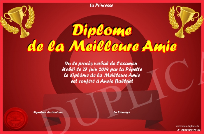 Envoyez par email votre Diplôme de la Meilleure Amie personalisé
