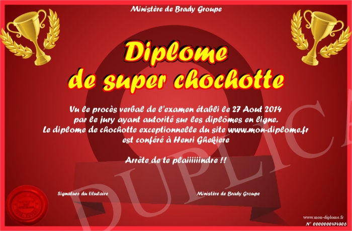 Envoyez par email votre Diplôme de super chochotte personalisé