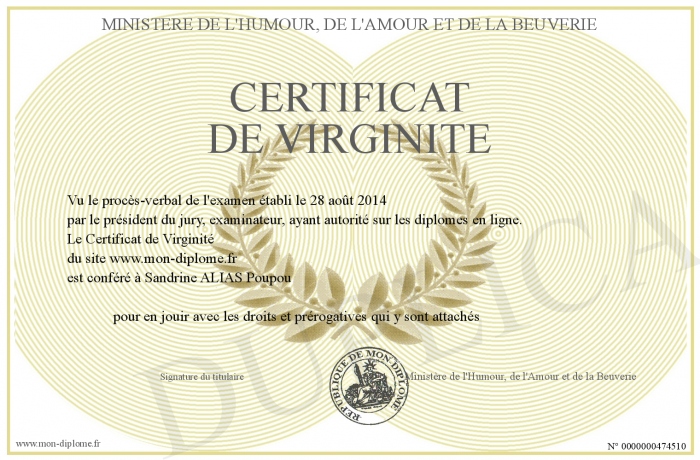 Envoyez par email votre Certificat de Virginité personalisé