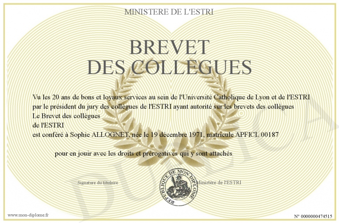 Envoyez par email votre Brevet des collègues personalisé
