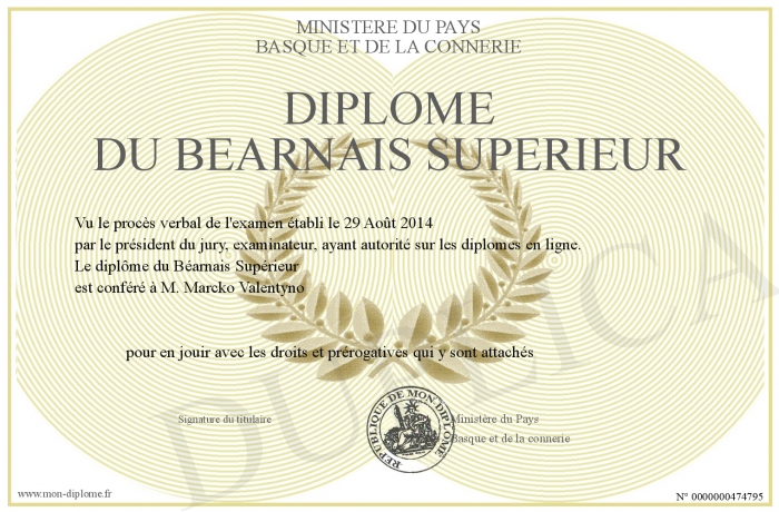 Envoyez par email votre Diplôme du Béarnais Supérieur personalisé