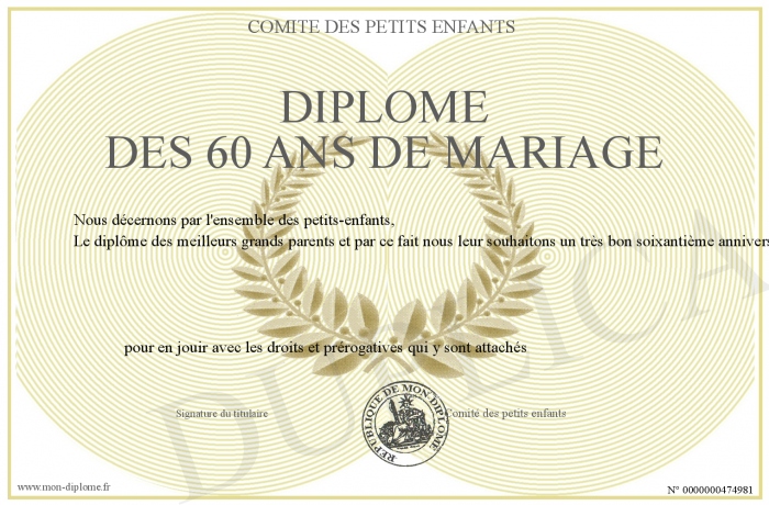 Envoyez par email votre Diplôme des 60 ans de mariage personalisé
