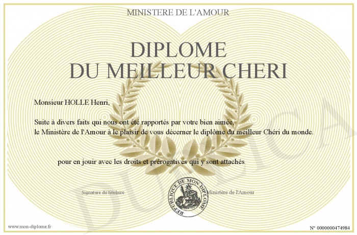 Envoyez par email votre Diplôme du meilleur Chéri personalisé