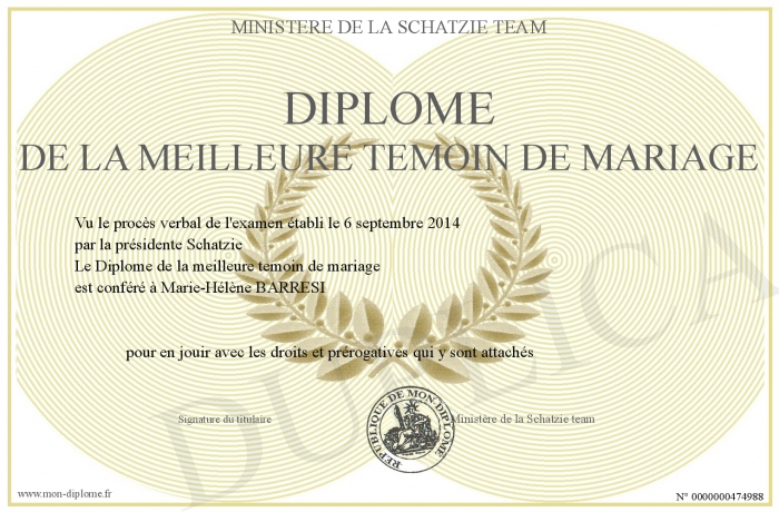 Envoyez par email votre Diplôme de la meilleure temoin de mariage personalisé