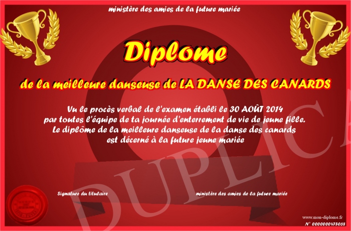 Envoyez par email votre Diplôme de la meilleure danseuse de LA DANSE DES CANARDS personalisé
