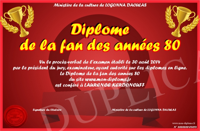 Envoyez par email votre Diplôme de la fan des années 80 personalisé