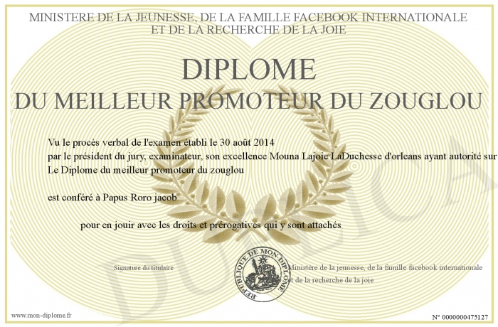 Envoyez par email votre Diplome du meilleur promoteur du zouglou personalisé