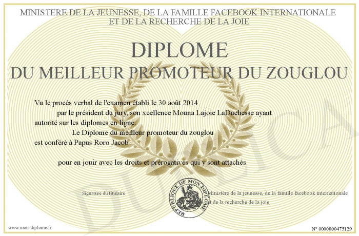 Envoyez par email votre Diplôme du meilleur promoteur du zouglou personalisé