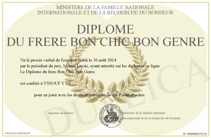 Envoyez par email votre Diplome du frere Bon Chic Bon Genre personalisé