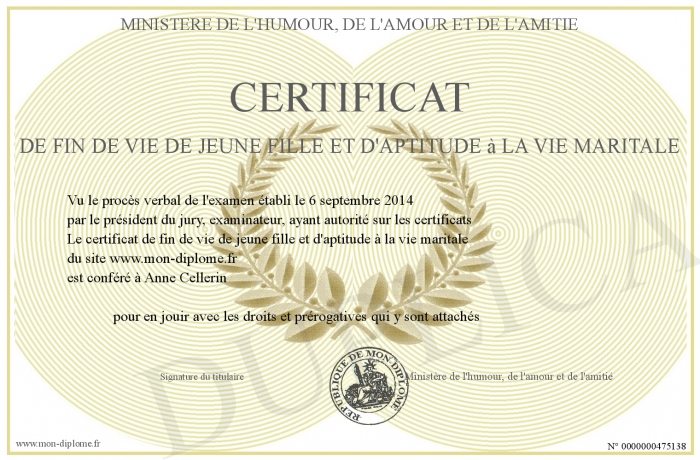 Envoyez par email votre certificat de fin de vie de jeune fille et d'aptitude à la vie maritale personalisé
