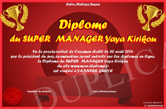 Envoyez par email votre Diplôme du SUPER MANAGER Yaya Kirikou personalisé
