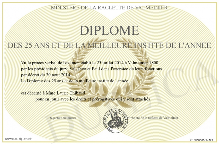 Envoyez par email votre Diplôme des 25 ans et de la meilleure instite de l'année personalisé