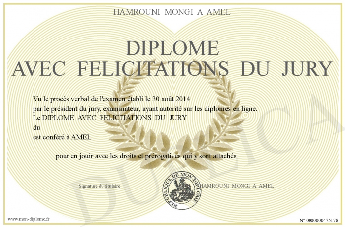 Envoyez par email votre DIPLOME AVEC FELICITATIONS DU JURY personalisé