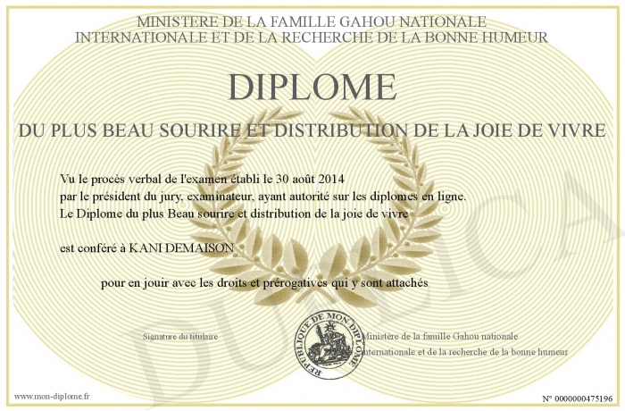 Envoyez par email votre Diplôme du plus Beau sourire et distribution de la joie de vivre personalisé