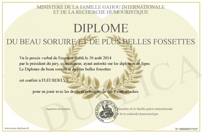 Envoyez par email votre Diplôme du beau soruire et de plus belles fossettes personalisé