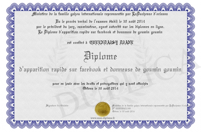 Envoyez par email votre Diplome d'apparition rapide sur facebook et donneuse de goumin goumin personalisé