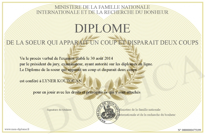 Envoyez par email votre Diplôme de la soeur qui apparait un coup et disparait deux coups personalisé