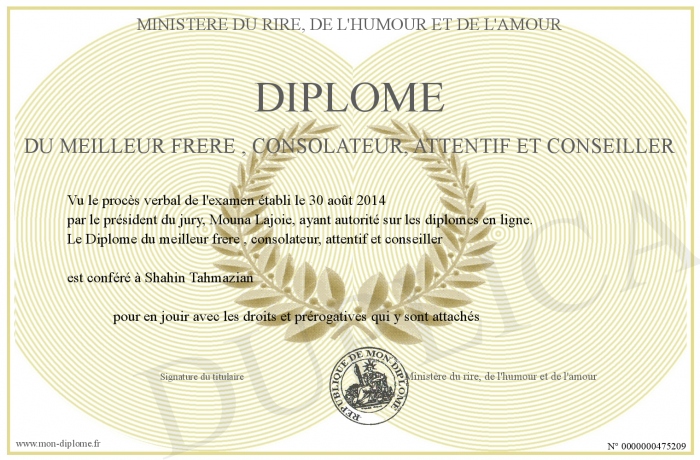 Envoyez par email votre Diplome du meilleur frere , consolateur, attentif et conseiller personalisé