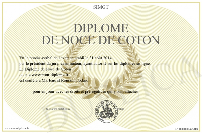 Envoyez par email votre Diplôme de Noce de Coton personalisé