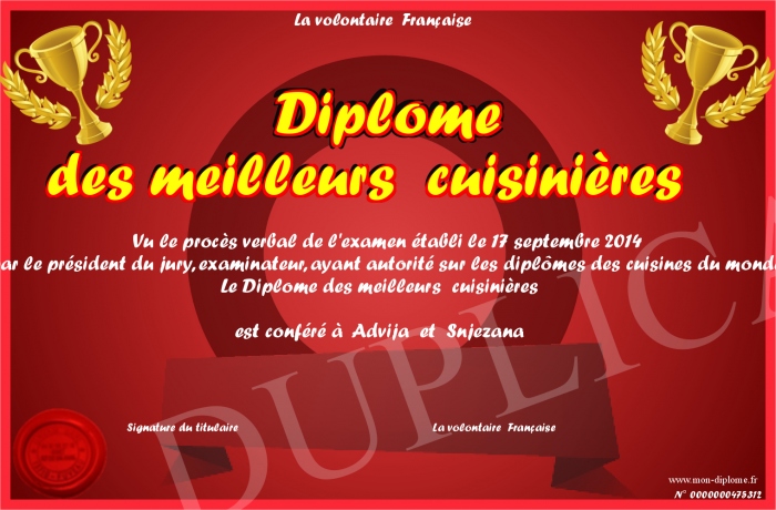 Envoyez par email votre Diplôme des meilleurs cuisinières personalisé